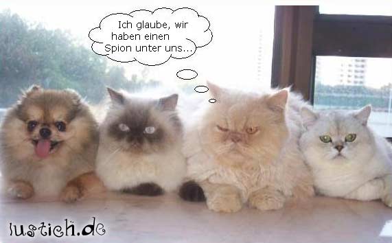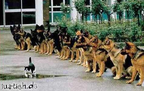 ja, die katze beweisst, wie mutig sie ist und die brave hunde haben die hundeprüfung bestanden. alles gut und ende gut.