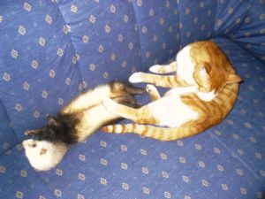 Unser Kater Jess der nun schon seit einiger Zeit nicht mehr da ist,hat sich das dann immer aus der Ferne angesehen. Freddy war ihm wohl zu impulsiv.