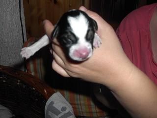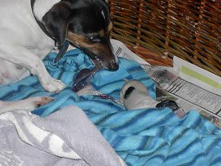 ca um 22:20 Uhr gehts wieder los , der 2te welpe kommt mit dem Kopf vorran auf die Welt.Füsschen stecken noch eine ganze Zeit drin , Mona muss mehrmals pressen, ich muss die Fruchtblase öffnen.Der 2te Welpe auch ein Rüde ist nicht ganz so propper und auch nicht ganz so fitt wie der 1ste .Mona leckt abwechselnd sich und den welpen , ich rubbel mit Handtuch und nach 10 Minuten ist auch er fit.