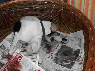 So gegen 21 Uhr mache ich meinen jüngsten im Bett , er darf heute bei mir schlafen, Mona kommt hinterher (wie jeden abend) legt sich aber nicht hin sondern ist unruhig und nervös. 21 Uhr:30 wirds feucht an meinen Füssen ui sie verliert Flüssigkeit .Nun aber schnell ab in das vorbereitete inzwischen mit Zeitungspapier ausgelegte Körbchen.