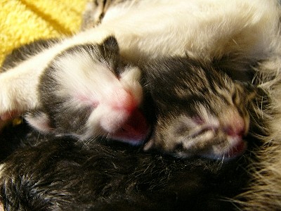 1:36 bin wieder aufgewacht durch das Maunzen von 2 kleinen Babys und das Geschmatze von Schnurrli die das 2. kleine pflegte, die übriegens braun (?) getiegert ist.