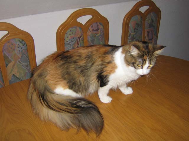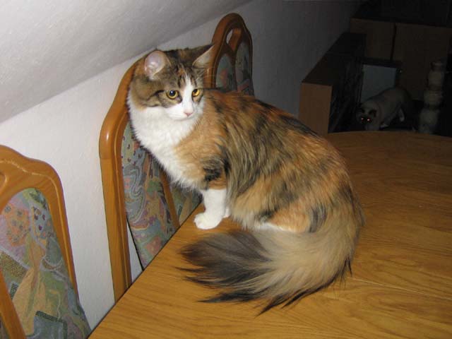 Da sie noch nicht kastriert ist, sollte ich sie eigentlich auch noch nicht mitbekommen. Also hatte ich keine Transportbox mitgenommen. Als ich dann da war, war es gleich Liebe auf dem ersten Blick. In der Wohnung wuselten einen Haufen Coonies rum, die Besitzerin/Züchterin wusste selber nicht mehr, wieviel sie hat. Ich schätze mal so 13 Katzen! (Auf nur 80 qm, aber den Coonies geht es dort gut!) Latifa fiel auf, weil sie mit einer Halbschwester die einzige helle war. Die anderen waren alle dunkel.