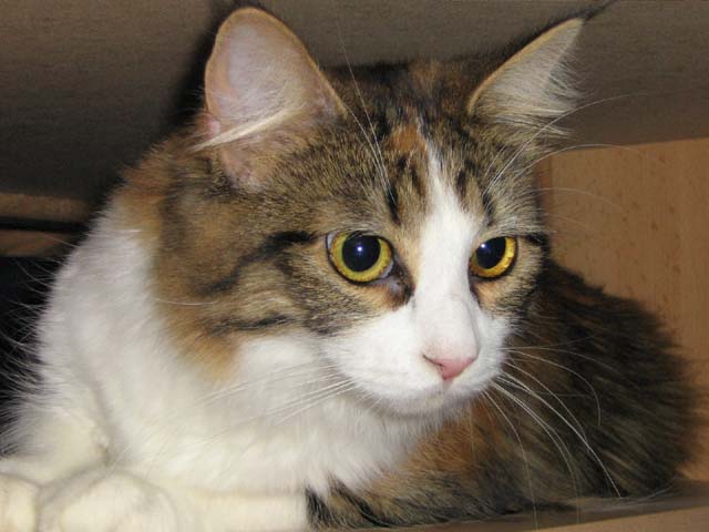 Da sie noch nicht kastriert ist, sollte ich sie eigentlich auch noch nicht mitbekommen. Also hatte ich keine Transportbox mitgenommen. Als ich dann da war, war es gleich Liebe auf dem ersten Blick. In der Wohnung wuselten einen Haufen Coonies rum, die Besitzerin/Züchterin wusste selber nicht mehr, wieviel sie hat. Ich schätze mal so 13 Katzen! (Auf nur 80 qm, aber den Coonies geht es dort gut!) Latifa fiel auf, weil sie mit einer Halbschwester die einzige helle war. Die anderen waren alle dunkel.