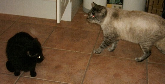 das heißt er hatte gestern Kastra, man ich sag es euch, ich war gestern morgen den Tränen nahe, nicht weil er zur Kastra musste, sondern weil Louie nicht in die Box wollte. Ich hab ne halbe Stunde gebraucht. Manny hat sich gedacht "oh was für ein tolles Spiel, ich will mitmachen" so rannte er mir auch immer zwischen die Füße. Blut ist dann auch geflossen (bei mir), Louie hat sich gewehrt, aber Hallo. Mein Mann fragt ja "wenn das ein Thai ist kann der auch Karate" Ja kann er, er wendet aber unfaire Techniken an...voll fies.