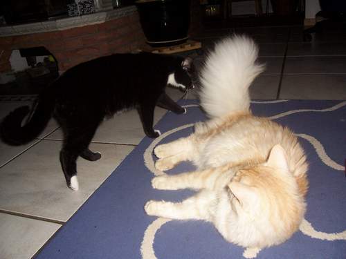 Das anfangs zierliche Katerchen hat seine Freundin in Gewicht und Größe jetzt total überholt und es ist witzig zu sehen wie meine Pandora sichtlich neben Leo "schrumpft"