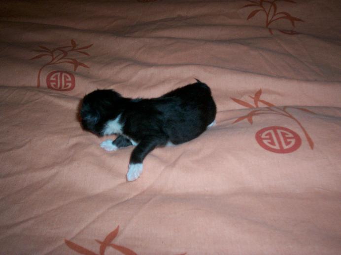 So wie es im Moment aussieht ist eins ganz schwarz, eins hat eine weisse Nase mit einem schwarzen Punkt und eins hat eine schwarze Nase mit einem weissen Punkt. Das 4. im Bunde ist auch schwarz mit einem kleinen weissen Strich ueber der Stirn... was die Fuesse angeht kann ich es noch nicht sagen, bei dem Gewusel war es schwer ueberhaupt etwas zu erkennen. Und bis auf der Kleine den ich einzeln auf dem Bild habe haben sie alle an Mamas Milchbar gehangen als wenn es kein Morgen mehr gaebe