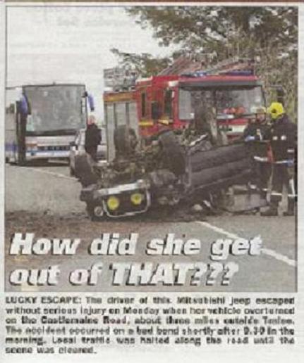 So, also nun 3 Tage nachdem ich die Woche unbedingt so chaotisch anfangen musste nun endlich das polizeiliche Beweisfoto aus dem 'Kerry Eye' - der oertlichen Klatschzeitung die einmal woechentlich erscheint. Bis zur Titelstory hat es nicht gereicht, aber immerhin auf Seite 6 ist mein Jeep, oder besser das was noch davon uebrig ist, zu bewundern!