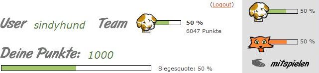 :biggrin:-- 50% zu 50% -- war immerhin für zwei Tage erreicht. Deswegen, hier ein Aufruff, an alle Hunde bei dem Duellen mitzumachen und die Katzen deren Vorherrschaft streitig zu machen !!