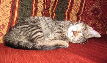 Sie springt jetzt hier durch die Gegend und hat mir sogar die Salbe schon verziehen, die wir ihr mit vereinten Kräften in die Augen befördert haben. Süße Maus! Wenn man genau hinschaut, sieht ihre Färbung gar nicht grau aus sondern eher hellsilbern und ich glaube, die Augen werden irgendwann mal grün.