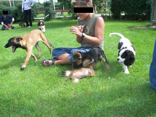 wir hatten erste welpenspielstunde und ich bin alles andere als begeistert. ich hatte mir schon extra den pinscher club rausgesucht. dummerweise war nur ein hund ein yorki, die anderen waren alle größer bis viel größer. es war ein 13 wochen alter belgischer schäferhund dabei und dummerweise hat er auch ein paar mal nach dem kleinen geschnappt. globschi ist dann immer gleich zu mir gerannt gekommen und hat sich versteckt. teils haben sie zu dritt globschi verfolgt und er ist ziemlich sauer dann geworden.