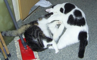 Ok, rufen hilft hier nicht weiter. Da muss ich Katergemeinheiten anwenden. Ich leg mich einfach immer in den Weg und trampel, wenn die Dosis schlafen auf ihnen herum. Häng meinen Po ins Gesicht von den Dosis, weil ich ja vom Bett aus die Spinne vorm Bett beobachten muss, wenn die Dosis schlafen. Wenn die Dosis wach sind, dann leg ich mich einfach weiter in den Weg. Das macht Spass.
