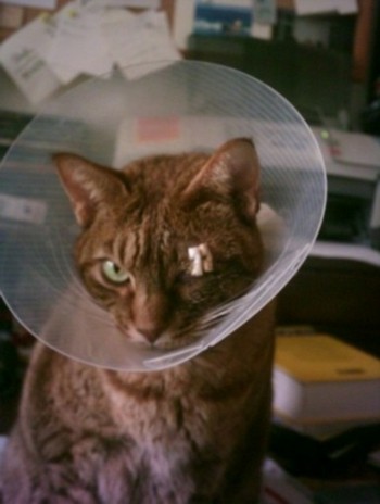 leo musste die krause 10 tage nach seiner op tragen und fand es auch furchtbar. aber nach ein paar tagen hatte er sich auch erstaunlich gut damit abgefunden.