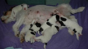 Und nun sind sie da. Inzwischen schon 11 Tage alt, wachsen und gedeihen sie prima. Wir haben leider einen kleinen Rüden verloren, nachdem wir ihn mehrere Tage stündlich gefüttert haben, Tag und Nacht, wir haben ihn gewärmt und uns nur um ihn gesorgt. Dann leider mußten wir feststellen, dass alles keinen Sinn macht und haben den kleinen Kerl einschläfern lassen. Obwohl nur 4 Tage alt geworden, war es furchtbar schwer. In den 4 Tagen haben wir viel geweint und hatten so gar keine Freude an den anderen. Doch danachkonnten wir aufatmen. Die schlechten Gedanken vergingen schnell in Anbetracht 5 gesunder knuffiger Welpen. Sie haben inzwischen ihr Geburtsgewicht mehr als verdoppelt und bald machen sie die Äuglein auf. Gott, sind die herrlich. Es ist unser erster Wurf, von daher ist die Aufregung ganz besonders groß. Ich mag gar nicht an den Tag denken, an dem wir sie wieder abgeben müssen. Aber 6 Hunde??? Ich glaube, da gibt´s zu Hause Streit