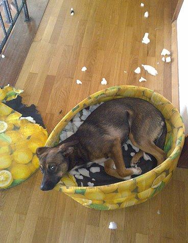 Wir haben ja nun alle Türen geschlossen, seitdem wir gesehen haben, was sie anrichtet, daher frisst sie jetzt wohl das einzige, was sie hat, ihren Korb. Eine Sporttasche, die zwei Tage im Flur stand, hat sie nicht angefressen.