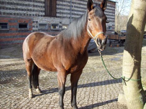 Salima ist Jahrgang 1993, eine Mischung aus 1/4 Vollblut und schwerem Warmblut. Sie ist durch die Tochter ihrer Besitzer ziemlich verritten, d.h. sie kennt nur Schritt und Galopp. Nichts anderes. Springreiter haben sie weiter "behandelt", sodass Salima unter gegenhaltendem Zügel Rückwärtstreten versteht. Schenkel kennt sie nicht.