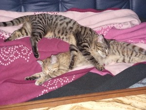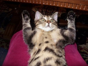 Beide waren anfangs sehr ängstlich, doch besonders unser Großer, der Odin, hat recht bald mit uns gespielt. Die kleine Frigga macht sich nun auch langsam... und gerade eben, haben wir wieder einen großen Sprung gemacht: Sie hat nach eineinhalb Wochen das erste Mal geschnurrt, als ich sie gestreichelt habe... hach *freu*