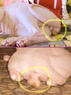 The skin is covered with a very fine down that resembles the texture of chamois so Sphynx feel like warm suede to the touch. A short fine down is accepted on the nose, around the ears and is most likely to appear at the tip of the tail, on the feet and the scrotum. Some females grow more hair during shedding, when pregnant or nursing, because of wrong feeding and when being kept in low temperature conditions.