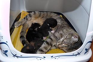 Scheint alles wunderbar zu laufen.Minni kümmert sich rührend um alles. Ab und an nimmt sie sich mal eine kleine Auszeit und legt sich vor die Box wenn die Jungen schlafen. Sobald sie dann nur einen Pieps von sich geben ist Mama wieder drin.