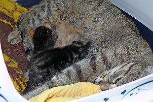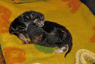 Scheint alles wunderbar zu laufen.Minni kümmert sich rührend um alles. Ab und an nimmt sie sich mal eine kleine Auszeit und legt sich vor die Box wenn die Jungen schlafen. Sobald sie dann nur einen Pieps von sich geben ist Mama wieder drin.