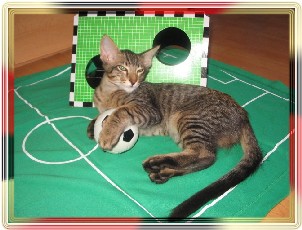Och kommt... Eure Katzis werden doch kleine Bälle zum spielen haben.... also außer dem Fussball, den unser Calli oben auf dem Bild festhält, fliegen zumindest hier ganz viele kleine Spielzeugbällchen rum... Es muss kein Fussballfeld oder so drunter sein... aber Ball spielende Katzen wären schon schön