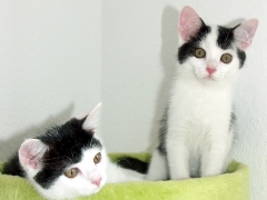 Das Geschwisterpärchen Jacky & Pointy sucht noch ein spannendes Zuhause. Die beiden sind sehr aufgeweckte, verspielte Katzenkinder und haben, wie Ihrem Alter entsprechend, ziemlich viele Flausen im Kopf und können einen so richtig zum Lachen bringen. Pointy schleppt gerne die Spielmäuse durch die Gegend, während Jacky es liebt mit Handtüchern zu spielen. Abends kommen Sie auch gerne auf die Couch und fordern Ihre Kuscheleinheiten ein. Da Sie in Ihrer Pflegestelle in einer Wohnungshaltung leben, können Sie sowohl als Freigänger als auch als Wohnungskatzen (evtl. mit einem katzensicheren Balkon) vermittelt werden.